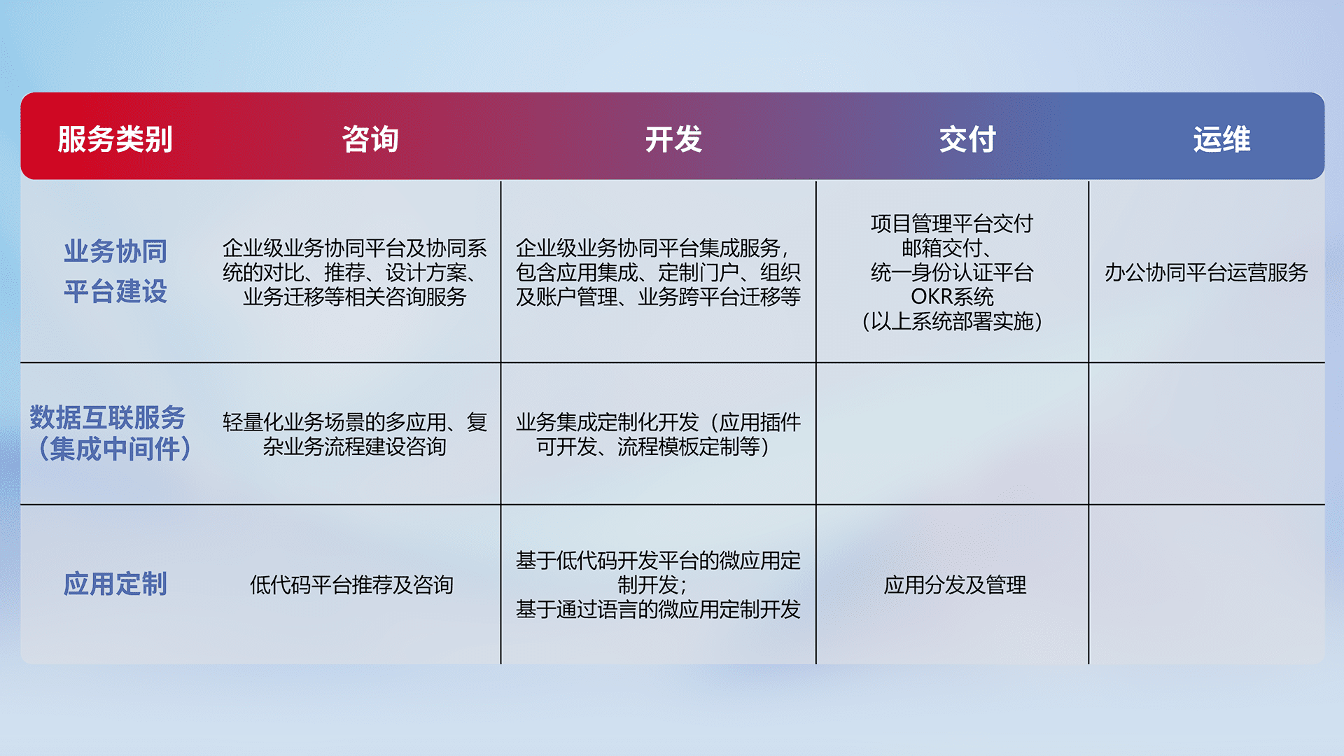 针对钉钉、、、企微、、IDaas等平台级产品提供产品的规划、、、方案、、交付、、定制化开发等服务,,,,实现如统一协同办公、、、、智能客户服务、、混合会议管理、、智能数据查询、、、、等业务场景,,,实现数字化转型。。。