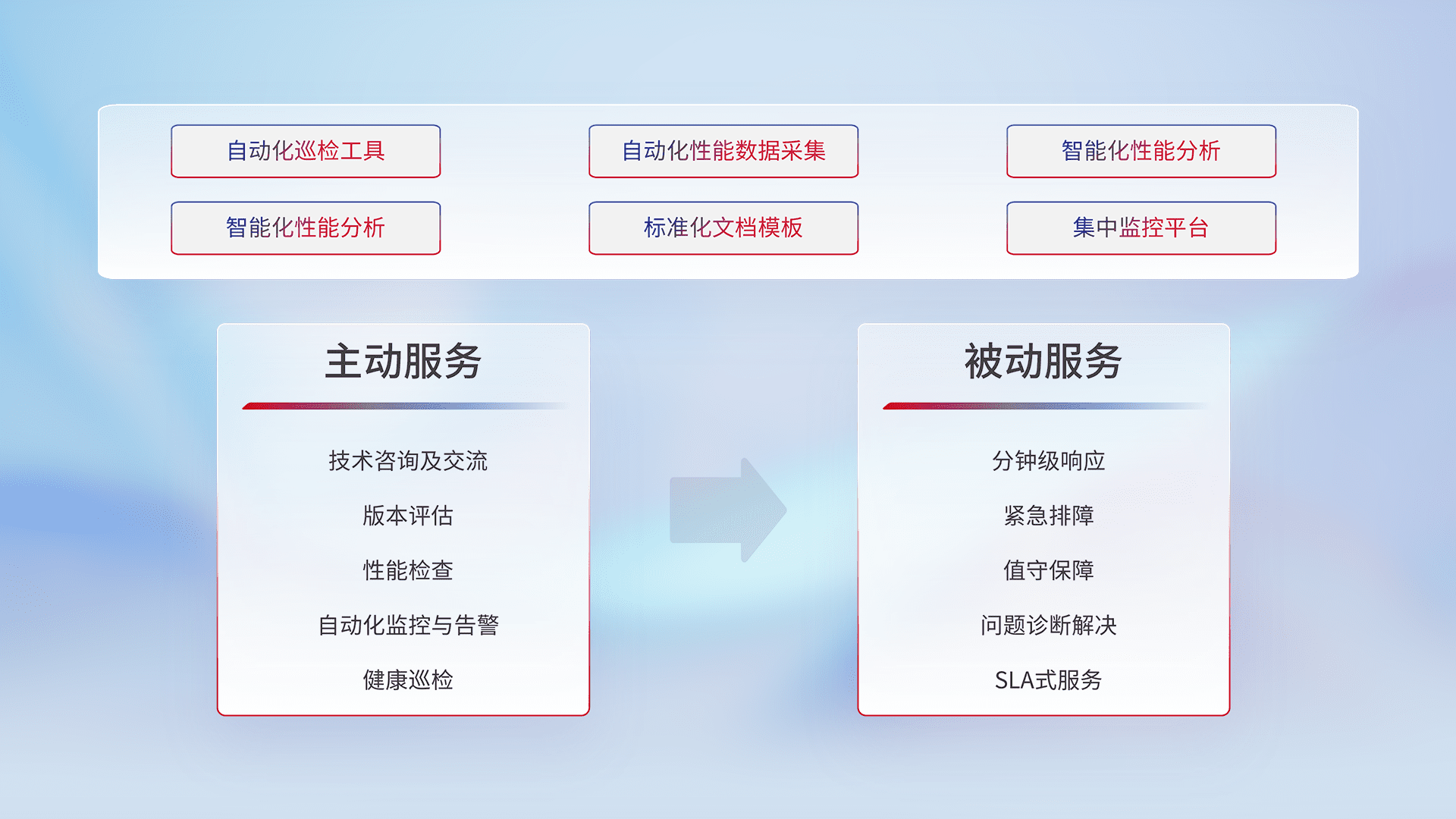 智能化工具和标准化文档,,,保障服务质量,,,,提供主动服务(包含技术咨询、、、版本评估、、、性能检查、、、自动化监控与告警、、、健康巡检)和被动服务包含(分钟级响应、、紧急排障、、值守保障、、问题诊断解决、、、SLA服务)。。